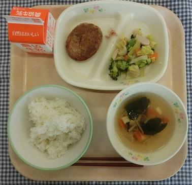 今日の給食献立は、白ごはん・ハンバーグ・彩り野菜のソテー・きのこのコンソメスープ・牛乳でした。