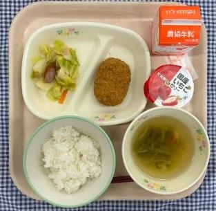 今日の給食献立は、白ごはん・コロッケ・ウィンナーと野菜のソテー・春のコンソメスープ・いちごゼリー・牛乳でした。今日は入学・進学おめでとう給食でした。