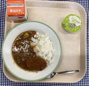 今日の給食献立は、麦ごはん・カツカレー・マスカットゼリー・牛乳でした。
