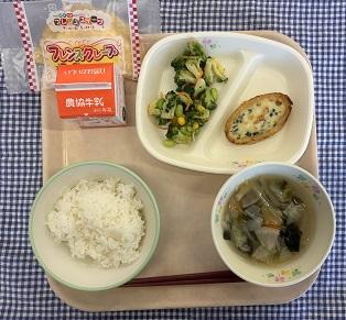 今日の給食献立は、白ごはん・ポテトカップグラタン・ブロッコリーのイタリアンサラダ・かぶのコンソメスープ・いちごクレープ・牛乳でした。