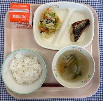 今日の給食献立は、白ごはん・魚の塩こうじ焼き・小松菜の煮びたし・しょうが風味の五色汁・牛乳でした。