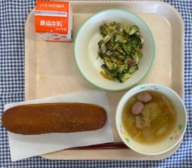 今日の給食献立は、きなこ揚げパン・ブロッコリーのソテー・洋風おでん・牛乳でした。