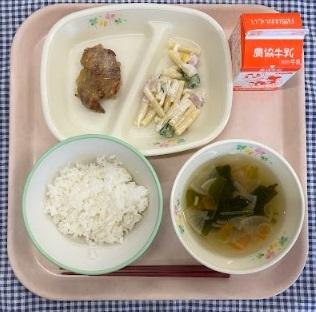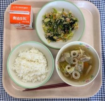 今日の給食献立は、白ごはん・キャベツとツナの酢の物・とり寄せ鍋風汁・牛乳でした。