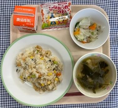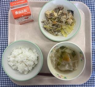 今日の給食献立は、白ごはん・厚揚げチャンプルー・海鮮ワンタンスープ・牛乳でした。