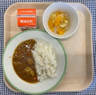 今日の献立は、麦ごはん・ポークカレー・フルーツポンチ・牛乳でした。