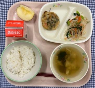 今日の給食献立は、白ごはん・チヂミ・三色ナムル・わかめスープ・りんご・牛乳でした。りんごは、かとうかず子さんから頂いたものです。