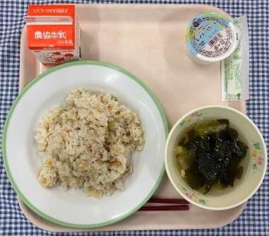 今日の給食献立は、鶏そぼろずし・小松菜となめこのすまし汁・レアチーズケーキ・牛乳でした。