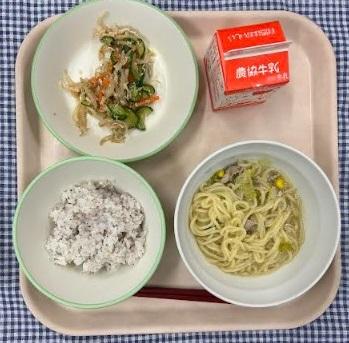 今日の給食献立は、ゆかりごはん・ささみときゅうりの和え物・みそラーメン・牛乳でした。みそラーメンはリクエスト給食です。