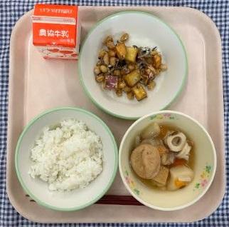 今日の給食献立は、白ごはん・大豆と小魚のごまがらめ・おでん風煮・牛乳でした。