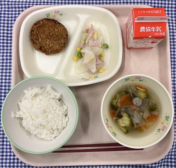 今日の給食献立は、白ごはん・メンチカツ・大根とハムのサラダ・ブロッコリーのコンソメスープ・牛乳でした。