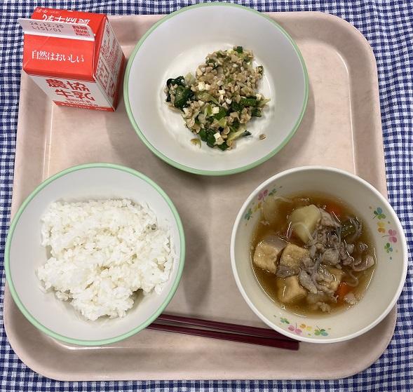 今日の給食献立は、白ごはん・チーズ納豆・肉じゃが・牛乳でした。