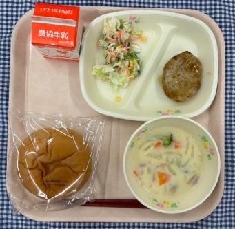 今日の献立は、バンズ(パン)・てりやきバーガー・キャベツのマヨサラダ・コーンクリームスープ・牛乳でした。