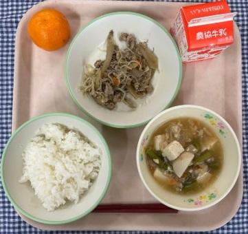 今日の給食献立は、白ごはん・かわりきんぴら・大根とひき肉のうま煮・みかん・牛乳でした。