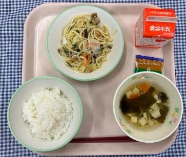 今日の給食献立は、白ごはん・珠洲塩やきそば・わかめのすまし汁・こんぶふりかけ・牛乳でした。