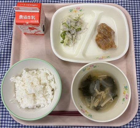 今日の給食の献立は、白ごはん・鶏肉のさんしょうみそ焼き・大根のゆかり和え・ほうれん草のみそ汁・牛乳でした。