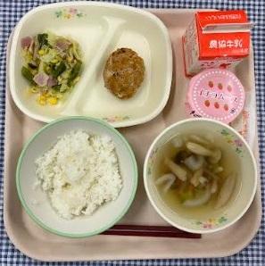 今日の献立は、白ごはん・CSDGsハンバーグ・彩り野菜のソテー・ブロッコリーのコンソメスープ・いちごムース・牛乳でした。