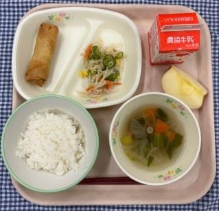 今日の給食献立は、白ごはん・切り干し大根の中華サラダ・りんご・牛乳でした。今日のりんごは、かとうかず子さんから提供していただいたものです。