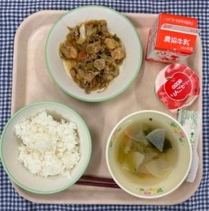 今日の献立は、白ごはん・ホイコーロー・かぶの中華スープ・りんごゼリー・牛乳でした。
