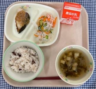 今日の給食献立は、小豆ごはん・ぶりの甘みそがけ・大根なます・いわのりのすまし汁・牛乳でした。