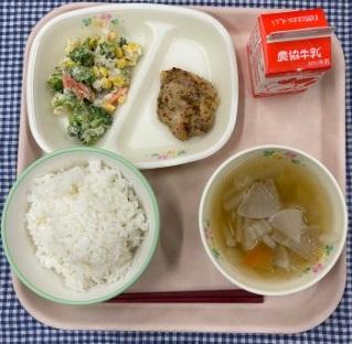 今日の給食献立は、白ごはん・ハニーマスタードチキン・ブロッコリーのごまマヨサラダ・冬野菜のコンソメスープでした。