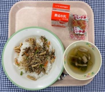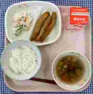 今日の給食献立は、白ごはん・ちくわの石垣揚げ・やたら漬け・なめこと大根のみそ汁・牛乳でした。