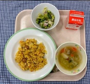 今日の給食は、ジャンバラヤ・グリーンサラダ・野菜のコンソメスープ・牛乳です。