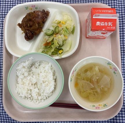 今日の献立は、白ごはん・チキンカツ・コールスローサラダ・マカロニコンソメスープ・牛乳でした。