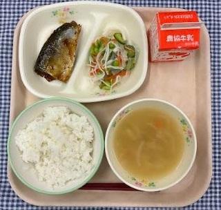 今日の給食献立は、白ごはん・さばのしょうが煮・枝豆と大根のサラダ・えのきと揚げのみそ汁・牛乳でした。