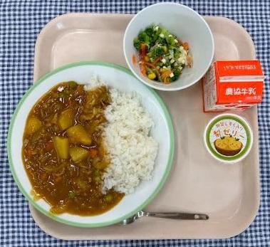 今日の献立は、麦ごはん・ポークカレー・ブロッコリーのチーズサラダ・梨ゼリー・牛乳でした。