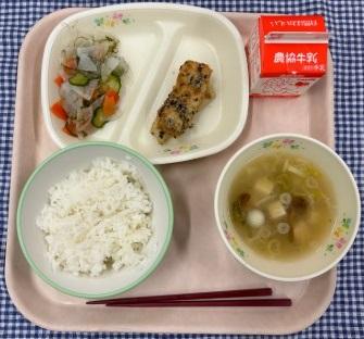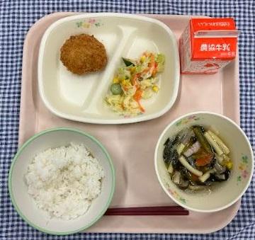 今日の献立は、白ごはん・ししゃもフライ・いかくんサラダ・おくらともずくのスープ・牛乳でした。