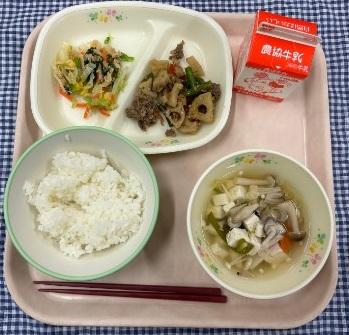 今日の献立は、白ごはん・牛肉とれんこんのピリ辛炒め・小松菜とツナの和え物・豆腐のすまし汁・牛乳でした。