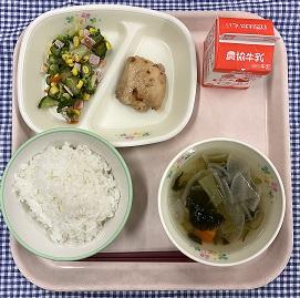 今日の給食献立は、白ごはん・鶏肉のレモンソースがけ・ブロッコリーのグリーンサラダ・大根のコンソメスープ・牛乳でした。