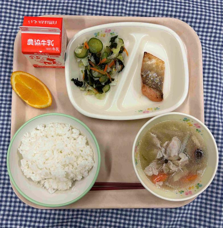 今日の給食献立は、白ごはん・さけのみそ焼き・かじめの煮物・豚汁・オレンジ・牛乳でした。