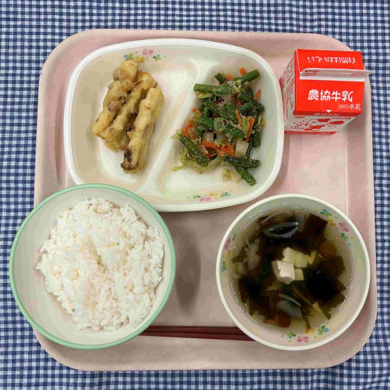 今日の給食献立は、ちくわのチーズ揚げ・いんげんのごま和え・豆腐のすまし汁・牛乳でした。