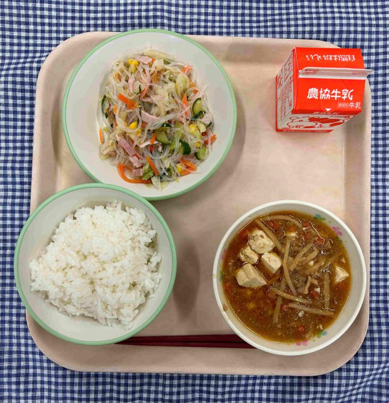 今日の給食献立は、白ごはん・春雨サラダ・マーボー豆腐・牛乳でした。