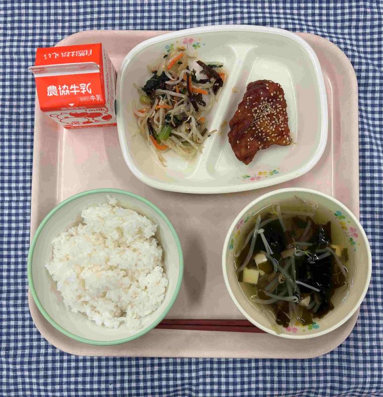 今日の給食献立は、白ごはん・ヤンニョムチキン・三食ナムル・わかめスープ・牛乳でした。