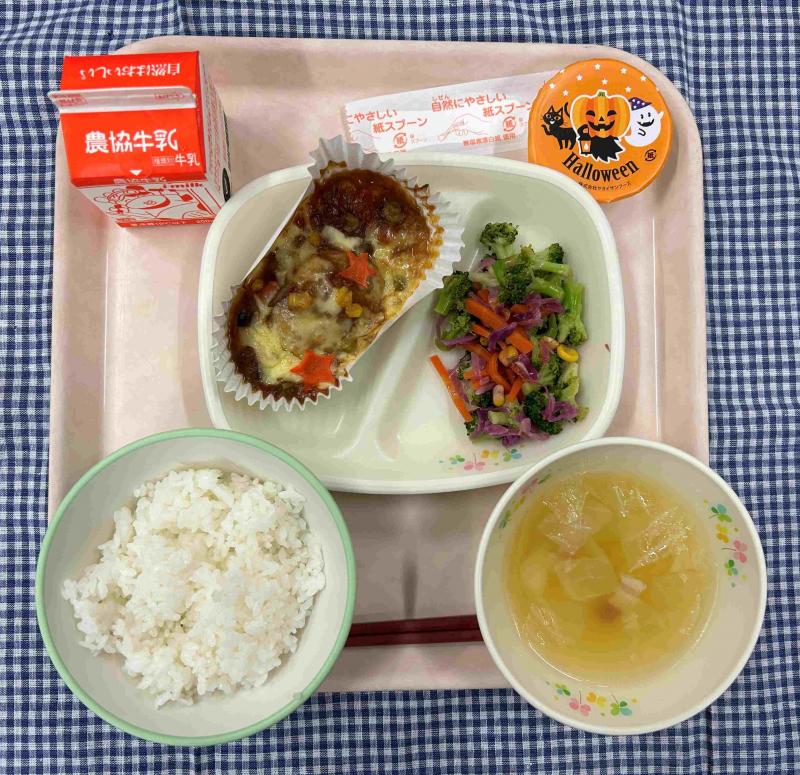 今日の献立は、チーズハンバーグ・ハロウィンサラダ・キャベツとベーコンのスープ・カボチャプリン・牛乳でした。今日はハロウィン給食でした。