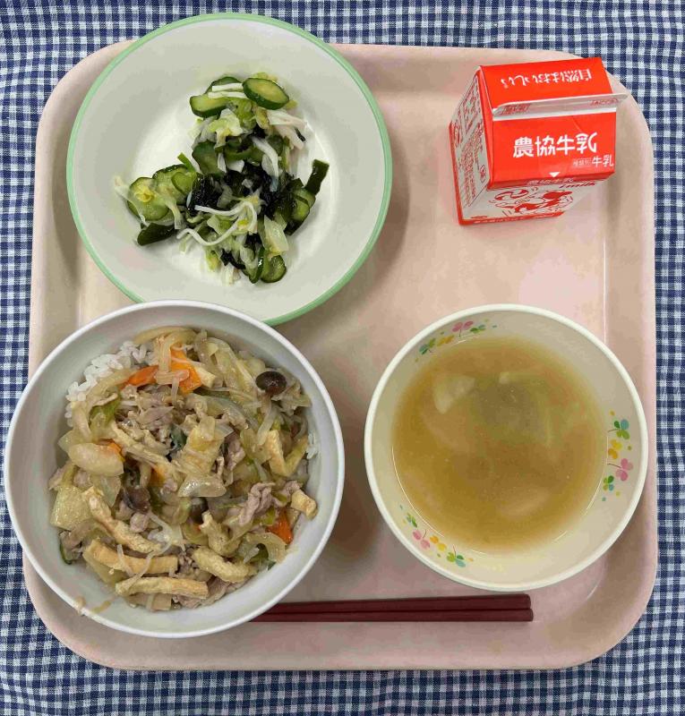 今日の給食献立は、みそ豚丼・きゅうりとかまぼこの酢の物・なめこと大根のみそ汁・牛乳でした。