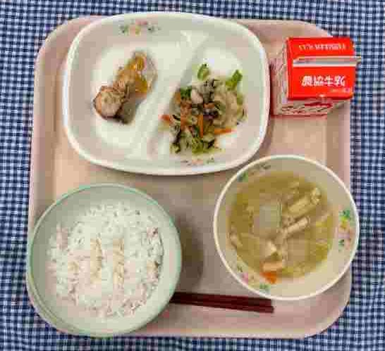 今日の献立は、白ごはん・ぶりのつけ焼き・小松菜と大豆のごま和え・野菜たくさん粕汁・オレンジ・牛乳でした。