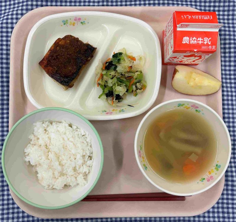 今日の献立は、白ごはん・魚のねぎみそ焼き・いわのりの磯香和え・さつまいもとしめじのみそ汁・りんご・牛乳でした。