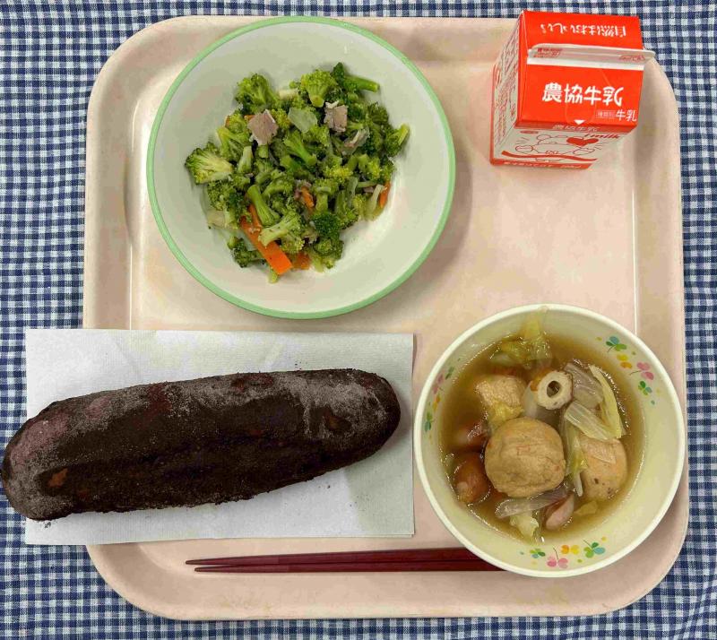 今日の献立は、ココア揚げパン・ブロッコリーのソテー・洋風おでん・牛乳でした。