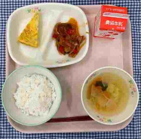 今日の献立は、白ごはん・スパニッシュオムレツ・カボナータ・ほうれん草のコンソメスープ・牛乳です。