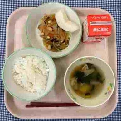 今日の献立は、白ごはん・鶏肉の照り焼き・紅白なます・のっぺい汁・牛乳です。