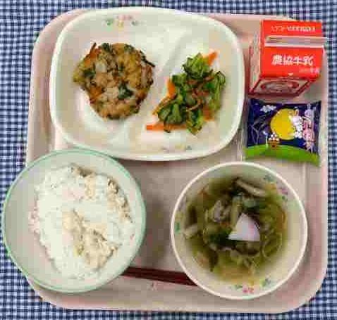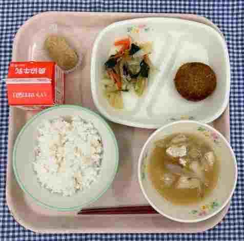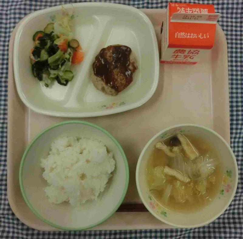 今日の給食献立は、白ごはん・ハンバーグ・わかめときゅうりの酢の物・里芋のみそ汁・牛乳でした。