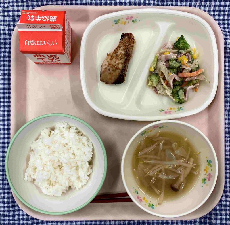 今日の献立は、白ごはん・ぶりのつけ焼き・野菜のみそマヨ・もやしのみそ汁・牛乳でした。