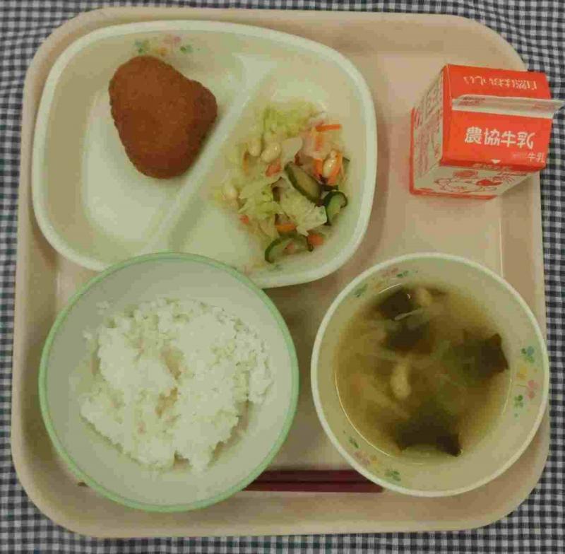 今日の給食献立は、白ごはん、栗コロッケ、いしるとレモンのサラダ、えのきと油揚げのみそ汁・牛乳でした。