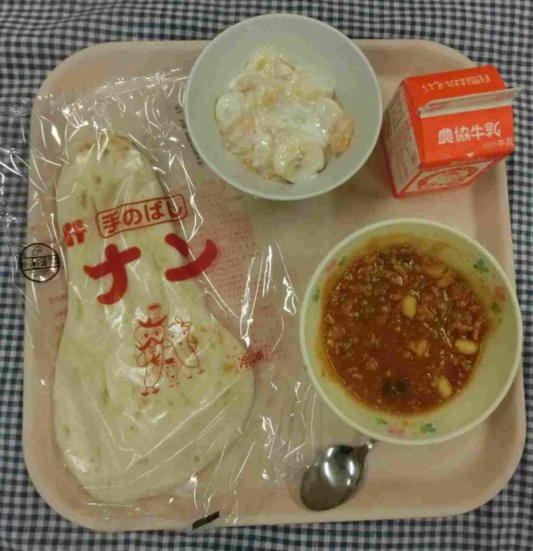 今日の給食献立は、ナン・キーマカレー・フルーツヨーグルト・牛乳でした。
