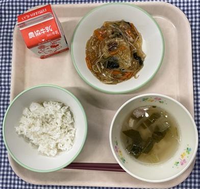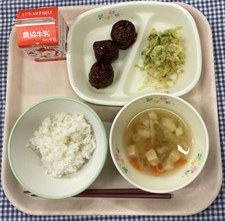 今日の給食献立は、白ごはん・肉だんご・たくあん和え・じゃがいもと油揚げのみそ汁・牛乳でした。
