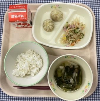 今日の給食献立は、白ごはん・小籠包・切り干し大根の中華サラダ・小松菜の中華スープ・牛乳でした。