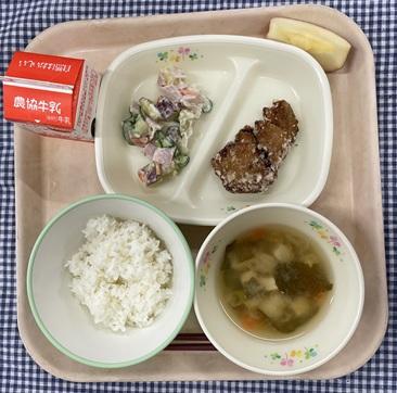 今日の給食献立は、白ごはん・さばの竜田揚げ・珠洲産さつまいものサラダ・珠洲産わかめと豆腐のみそ汁・りんご・牛乳でした。